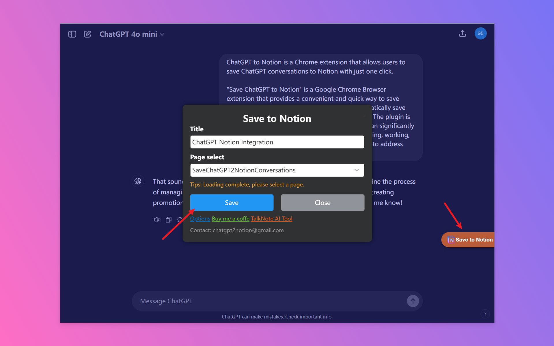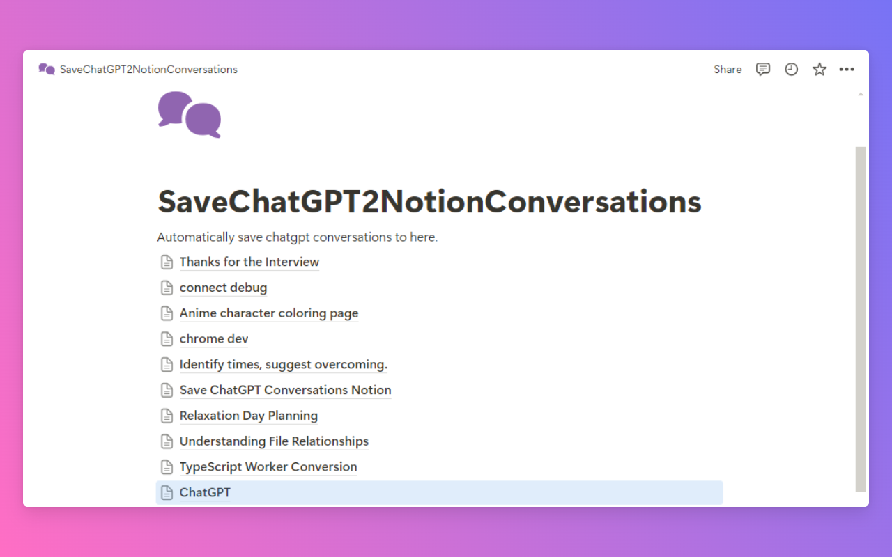 ChatGPT to Notion is a tool that simplifies saving your ChatGPT conversations to Notion with just one click.